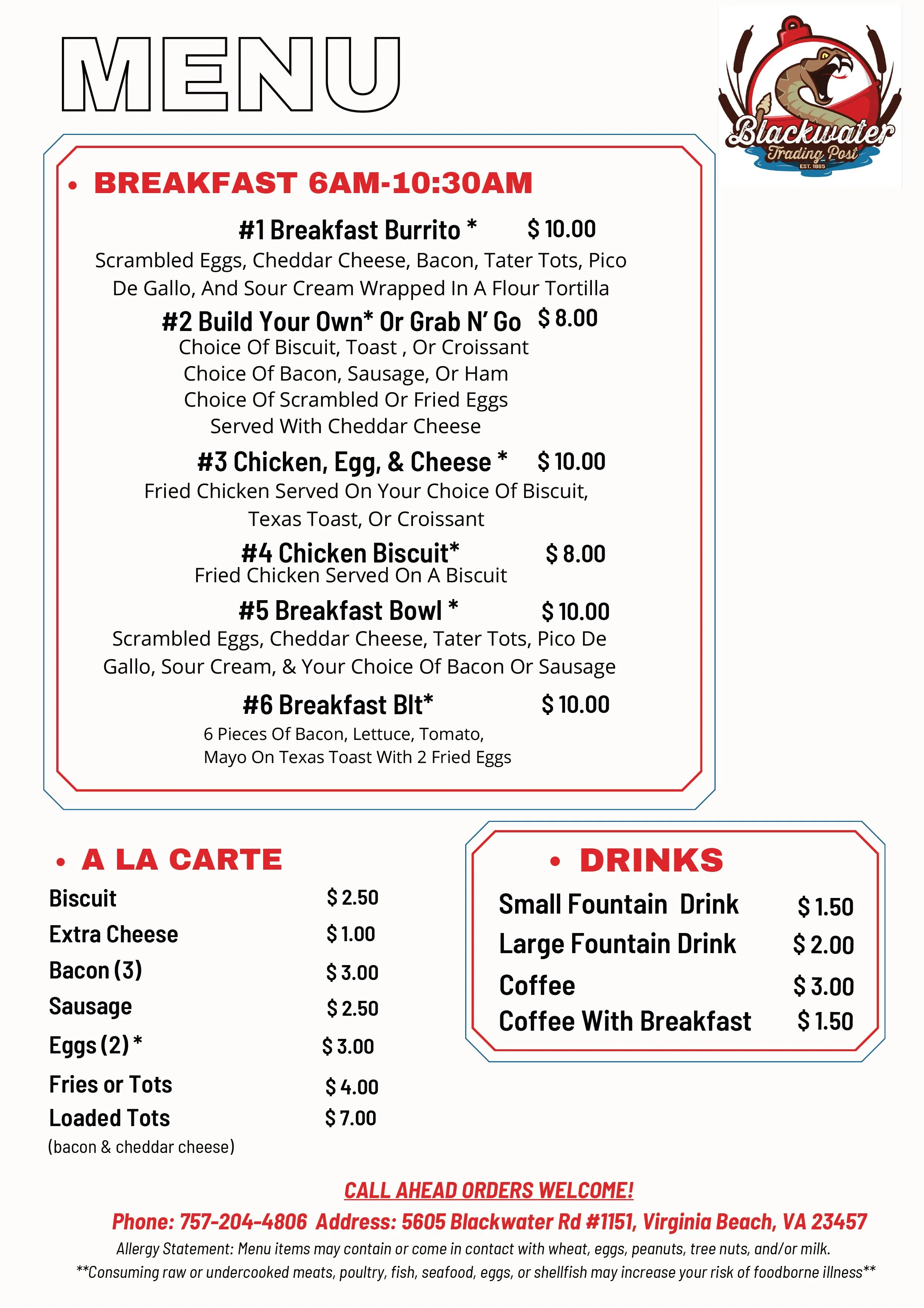 Email Blkwatertradingpost@gmail.com for all catering/event inquiries.